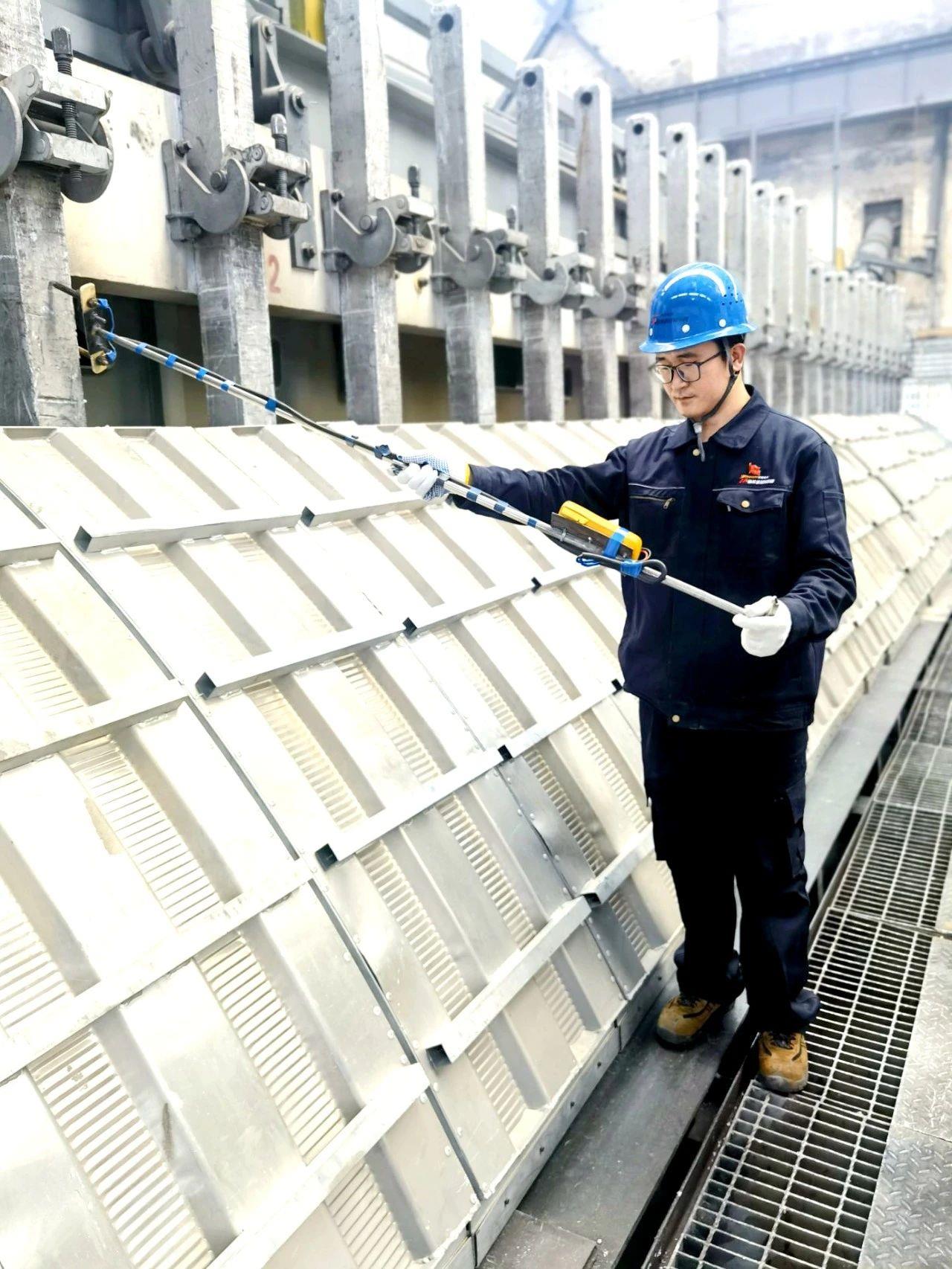 在45℃左右电解槽槽道内,电解工陈小永正在进行电解槽阳极导杆卡压测量作业。