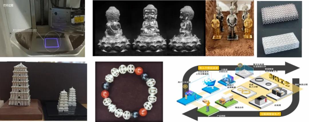 经过三年的研究建设,团队目前形成成果并申请专利40余项,获得专利授权18项,其中发明专利10项。在贵金属增材制造领域,原创性的光固化成型技术已经达到了国际领先水平,形成涵盖“原料制备、结构设计、补偿算法、打印工艺、热处理制度、表面处理”的全链条新工艺技术,实现复杂贵金属构件的3D打印稳定成型。现已完成日产10公斤的贵金属增材制造的产线搭建,其中包含贵金属粉体原料制产线、热处理产线、表面精饰产线及产品检验测试中心,实现金、银、铂等贵金属材料的直接3D打印成型,并结合陕西IP完成了20余款文创产品的开发。计划于3年内实现年产能1.3吨,年产值1.5亿元,利润总额2500万元,建设产业化示范中试生产线,成熟后达到增材制造金基200kg/年,铂基100kg/年,银基1t/年的生产目标。
