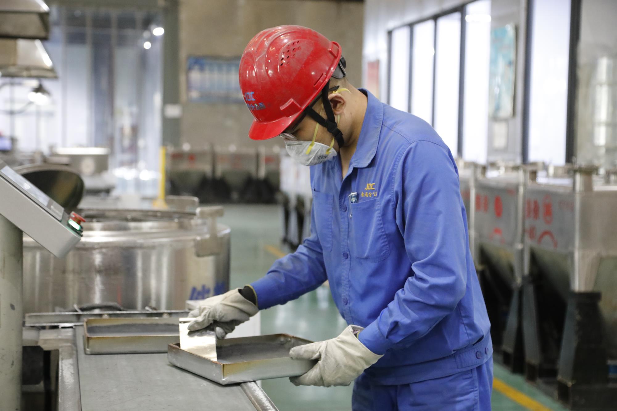 在生产现场,班组长与安全员们头戴醒目的白色安全帽,佩戴安全袖标,时刻关注着生产过程中的每一个环节。其余人员则统一佩戴红色的安全帽,他们或正在进行筛分放料,或正在进行验料作业……这种“色彩+袖标”的方式,让班组人员的身份更明确,现场管理的警示作用也进一步加强,大家严格遵循标准操作流程,确保生产的安全、精度和效率。