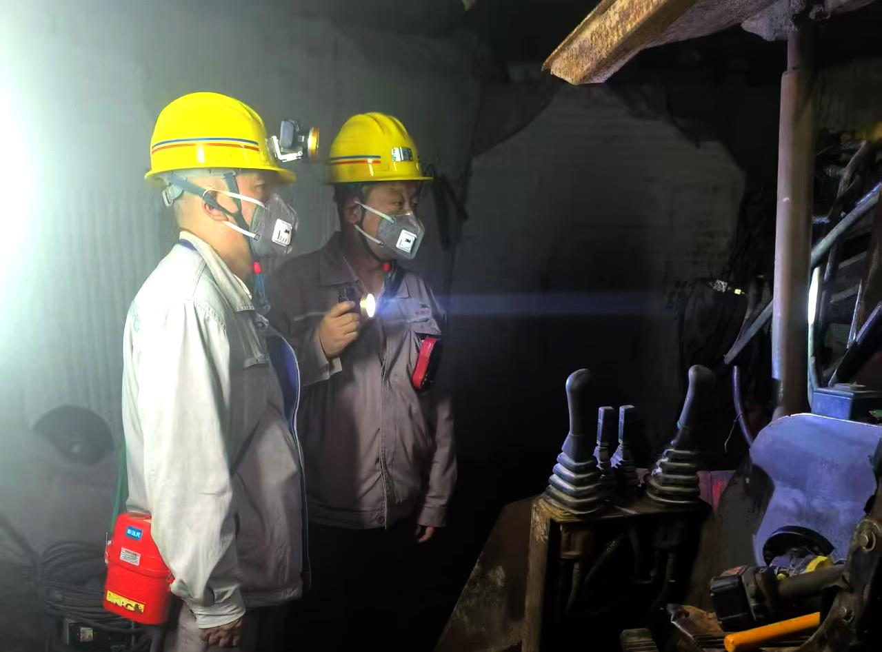 王鑫(右)正在对井下设备进行安全检查