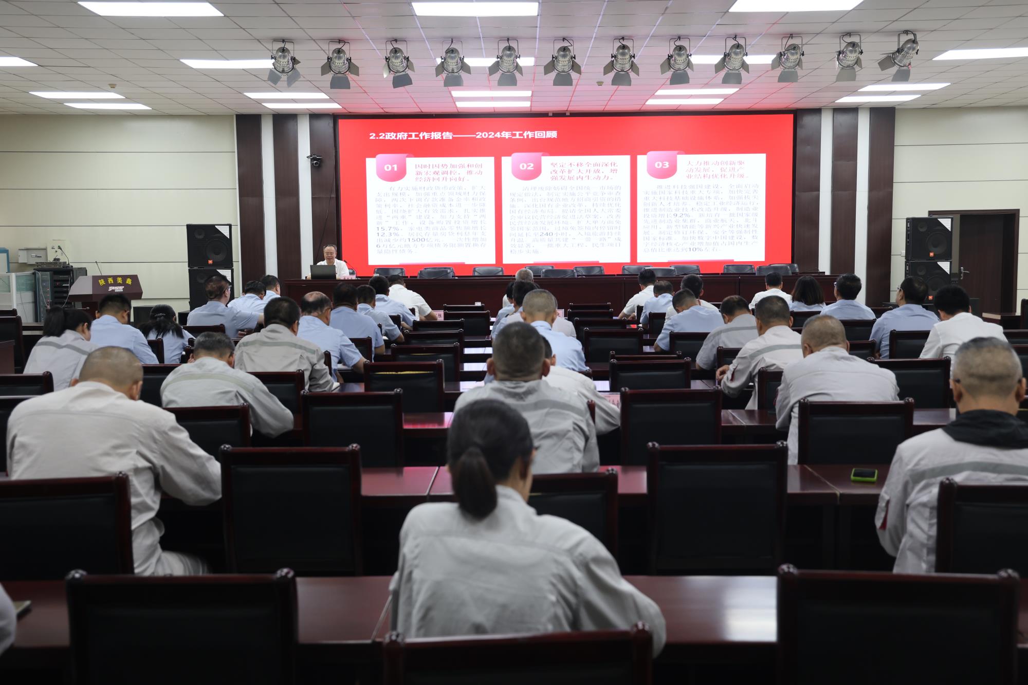 宣讲设陕西美鑫主会场,陕西美鑫公司领导班子成员,机关各部门负责人;二级单位党组织负责人、综合办公室主任、党务专责;铝镁合金分公司电解二车间党员代表现场聆听宣讲。榆林新材料集团、天瑞硅材料两个分会场视频参会。