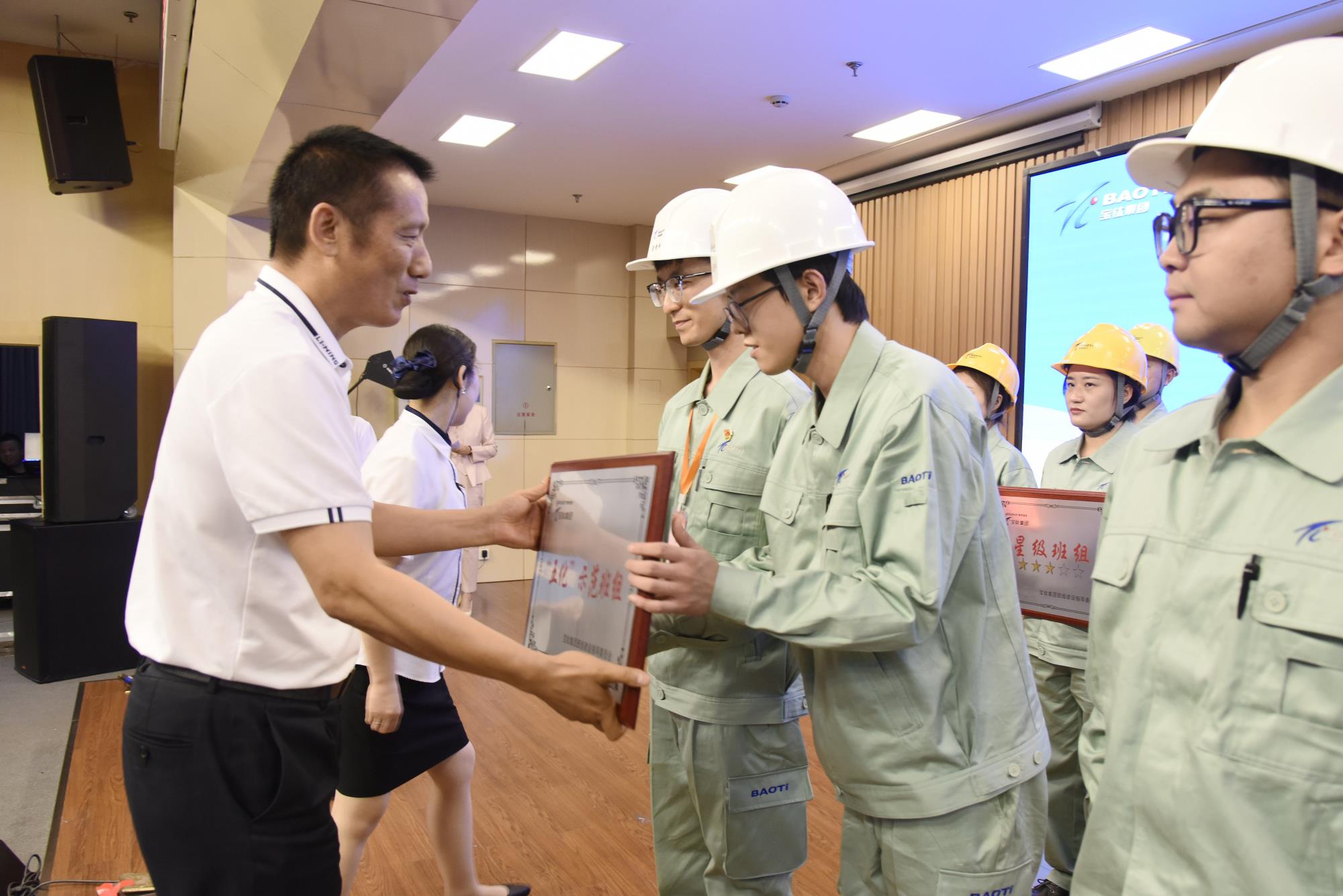 王俭、张凡、何书林、何联国、邓振海分别为获奖班组颁奖。值得关注的是,此次大赛第一名班组——质量部三站探伤组将代表陕西有色金属集团,出征由陕西省机械冶金建材工会组织的班组建设大赛,肩负起更光荣的使命与责任。