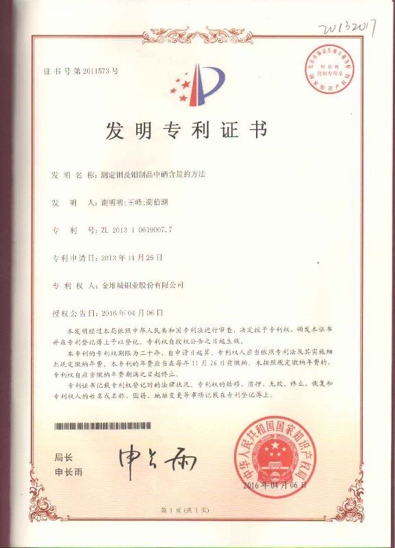 日前,金钼集团《测定钼及钼制品中硒含量的方法》获国家发明专利。这是该公司在分析检测方面首次获得的发明专利。