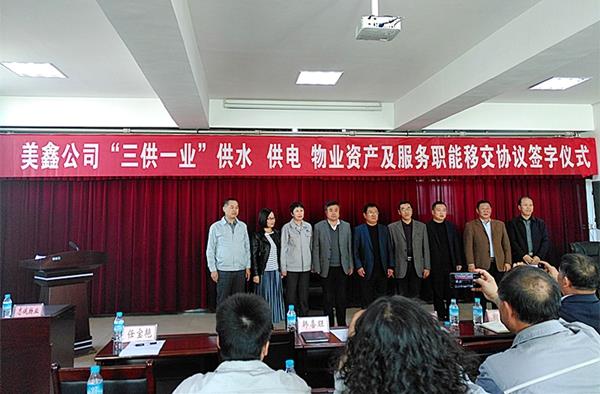 在签约仪式上,铜川市国资委副主任韩喜旺对公司 “三供一业”剥离移交工作给予了充分肯定。国有企业职工家属区“三供一业”分离移交工作是党中央、国务院作出的重大部署。而美鑫公司领导的高度重视,使剥离工作在克服了诸多困难后,有计划、有办法并富有成效,确保了“三供一业”分离移交工作有序推进。同时要求接收专业公司认真制定接收方案,发挥专业优势,提供优质高效的服务,给职工制造一个优美、舒适、和谐的居住环境。