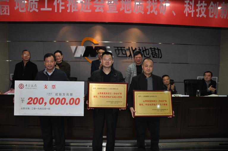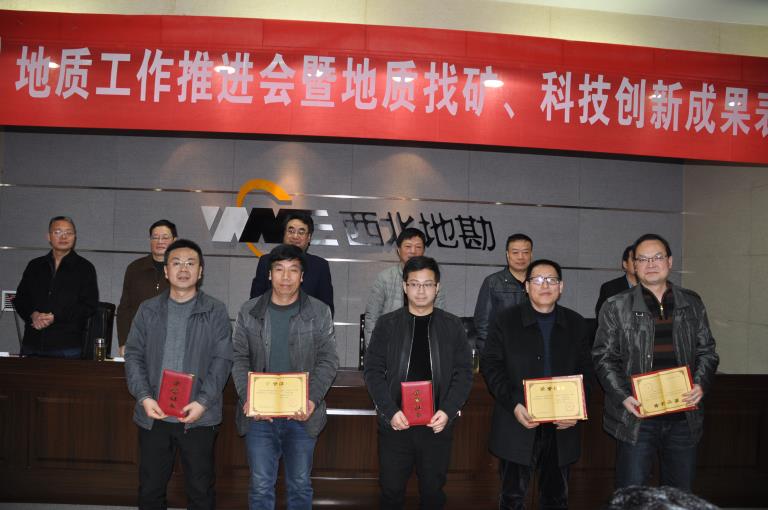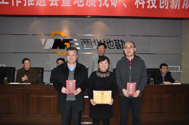会议对地矿集团、黄金集团地质找矿和科技创新成果进行了表彰奖励。授予713总队、山阳秦鼎矿业有限公司“2018年度地质找矿发现奖二等奖”,奖励胡远平、胡兴旺、王亚伟、王向阳、李剑斌等技术人员20万元;授予“智能化自动注射进样多通道原子荧光光度计的研制与应用技术研究”项目“科技创新成果奖”,奖励3万元;授予李日升博士“先进科技工作者”荣誉称号,奖励5千元;授予地矿集团地球物理院士专家工作站“先进科技集体”荣誉称号,奖励1万元;授予陕西省贵金属材料创新中心“2018年度科技创新突出贡献奖”,奖励3万元。地矿集团、黄金集团领导为获奖代表颁发了证书和奖金。
