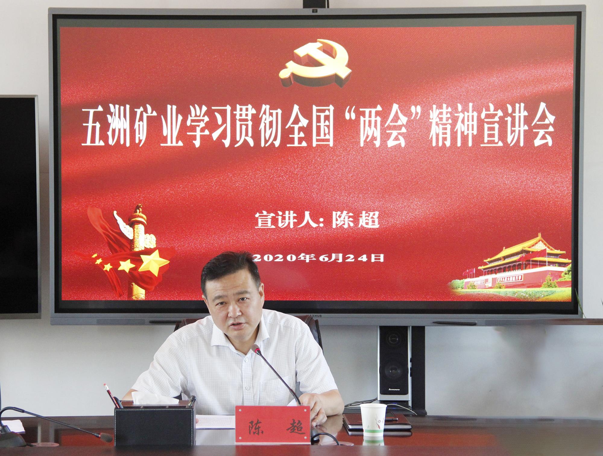 为深入学习贯彻2020年全国两会精神,根据集团公司党委安排,6月24日上午,五洲矿业召开学习贯彻全国两会精神宣讲会。五洲矿业党委副书记、总经理陈超作专题宣讲辅导。五洲矿业领导班子成员、总经理助理、机关各部室负责人、各基层单位党政正职聆听了宣讲辅导。