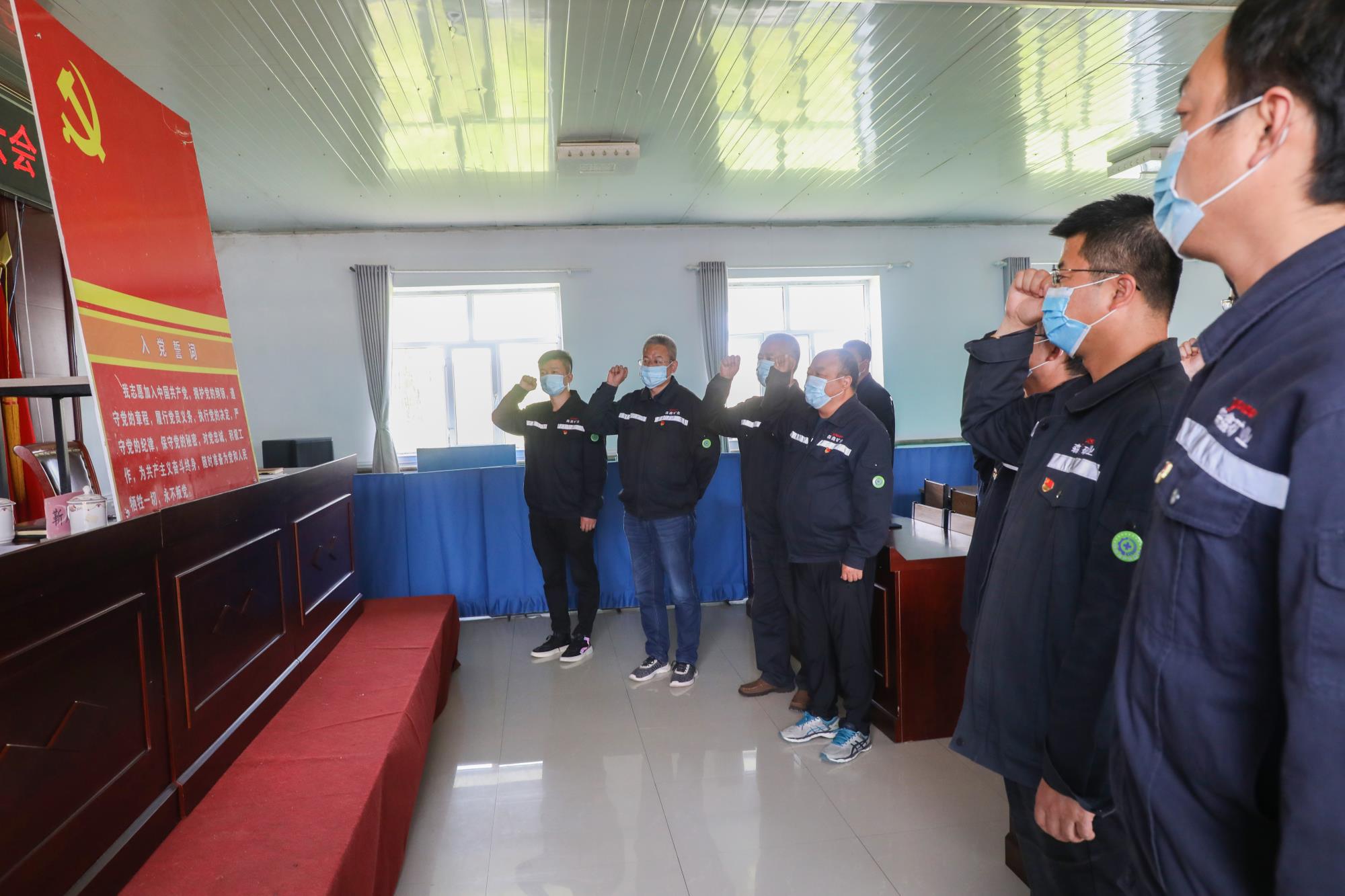 全体参会党员佩戴党徽,在公司党委书记杨开鹏的带领下,面对鲜艳的党旗进行了入党宣誓和重温入党誓词活动。