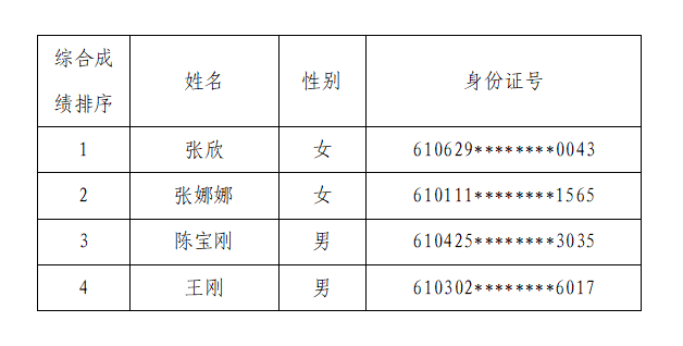 陕西有色金属集团选配总部纪检监察一般工作人员公开报名、资格初审、笔试、资格复审、面试等程序已经结束,按照综合成绩排序,现将拟聘用的4名人员情况予以公示。