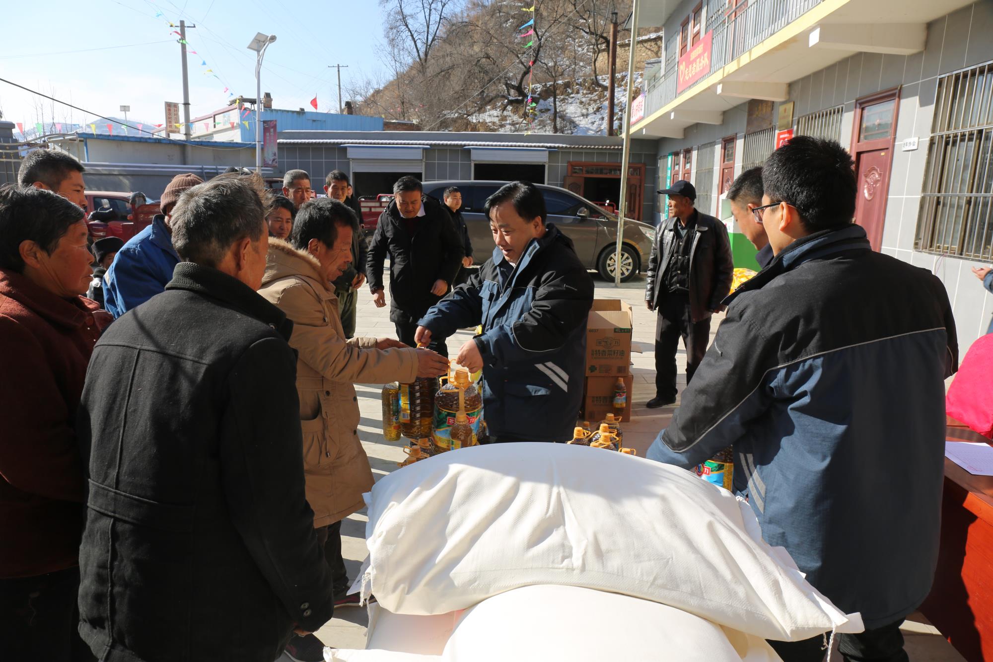 公司党委慰问刘家坬村贫困村民,向村民送上慰问品米、面、油