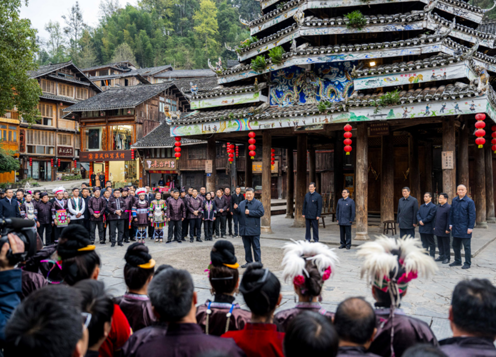 3月17日至18日,中共中央总书记、国家主席、中央军委主席习近平在贵州考察。这是17日下午,习近平在黔东南州黎平县肇兴侗寨考察时,身着民族盛装的村民在寨门口唱起侗族大歌欢迎总书记。