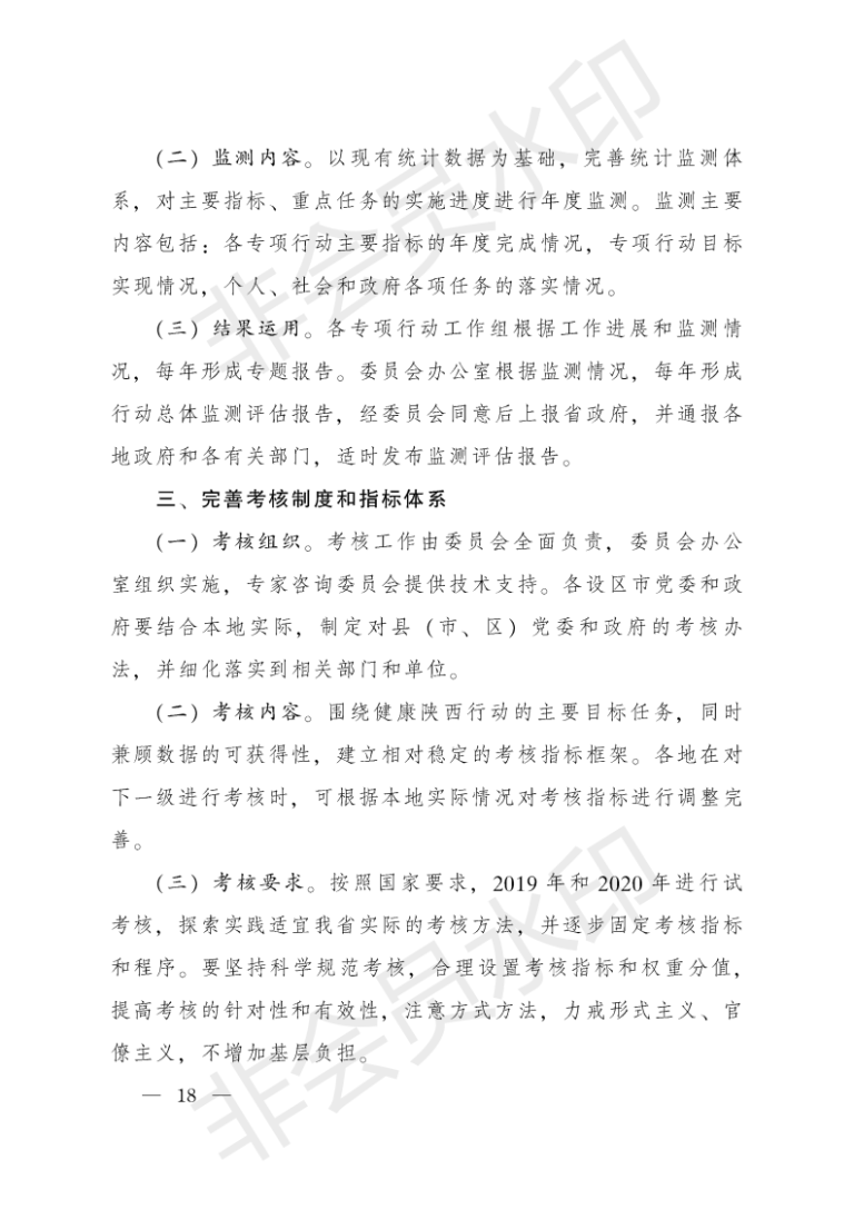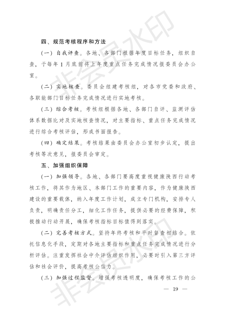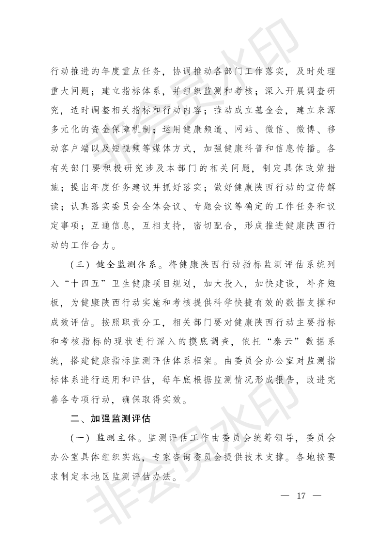 (一)加强组织领导。在省委、省政府领导下,由健康陕西建设工作委员会统筹推进健康陕西行动,负责组织实施《健康陕西行动(2020—2030年)》,组织开展行动监测评估和考核评价,指导各设区市编制实施具体行动方案。各部门要通力合作、各负其责、细化措施,把预防为主、防病在先融入各项政策举措中,全面推进健康陕西行动。