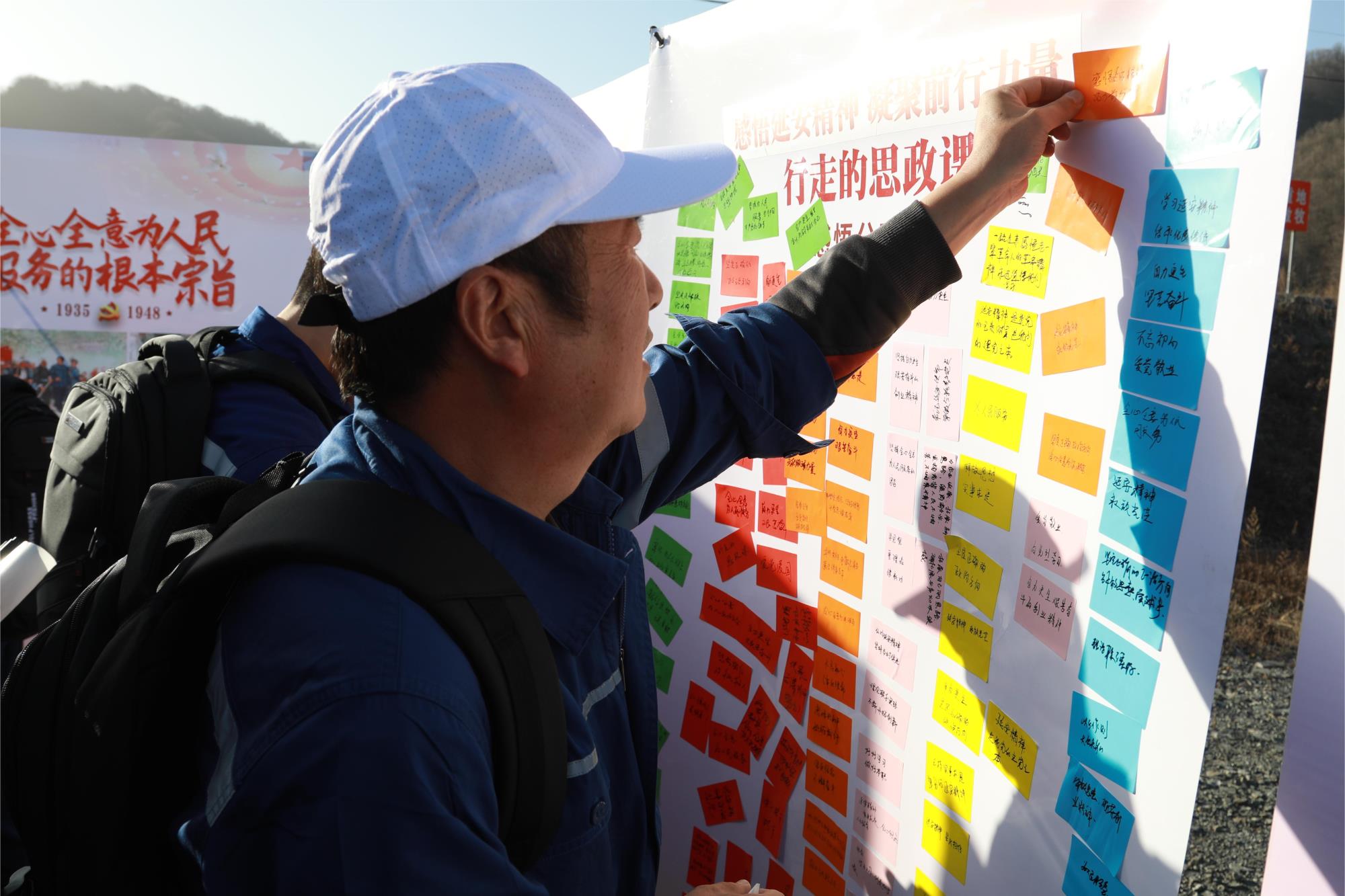 行至终点,研讨交流拉开帷幕,大家纷纷拿起便签纸,抒写感悟、畅谈心得……一阵阵激烈研讨交流过后,展板上贴满了干事创业的激情和立足岗位建新功的誓言。