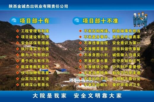 金钼集团金诚钒业位于陕西省商洛市山阳县王闫镇,承载着吕东沟钒矿建设任务,该地区地理位置偏远、工作条件艰苦,公司员工发扬“以企为家、勇于担当、艰苦奋斗、勤俭节约”的工作作风,秉承“艰难困苦、玉汝于成”的创业精神,虽偏远不忘抓廉洁、虽艰苦不忘强管理,制定了“十有”、“十不准”规定,自觉践行讲规矩、知敬畏、存戒惧、守底线的规矩意识,将教育客体纵向延伸至项目建设一线普通党员和管理人员,有效落实廉洁宣教“进班子、进部门、进班组、进家庭和上墙面、上桌面、上版面、上网站、上手机”的工作要求,为项目建设顺利实施提供了坚强的纪律保障。
