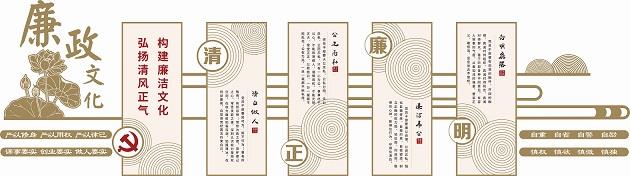 文化墙以“清、正、廉、明”为主题,以圣洁、高雅的荷花和纯净、灵动的祥云为设计背景,有着“出淤泥而不染”“拒腐蚀永不沾”的寓意;以圆形、方形为设计元素,象征着规范、法则、标准、界线,有着“无规矩不成方圆、有敬畏方知行止”的寓意;以金色为文化墙主色调,象征着坚定、纯粹、高贵,有着“真金不怕火炼”“无惧磨砺考验”的寓意。